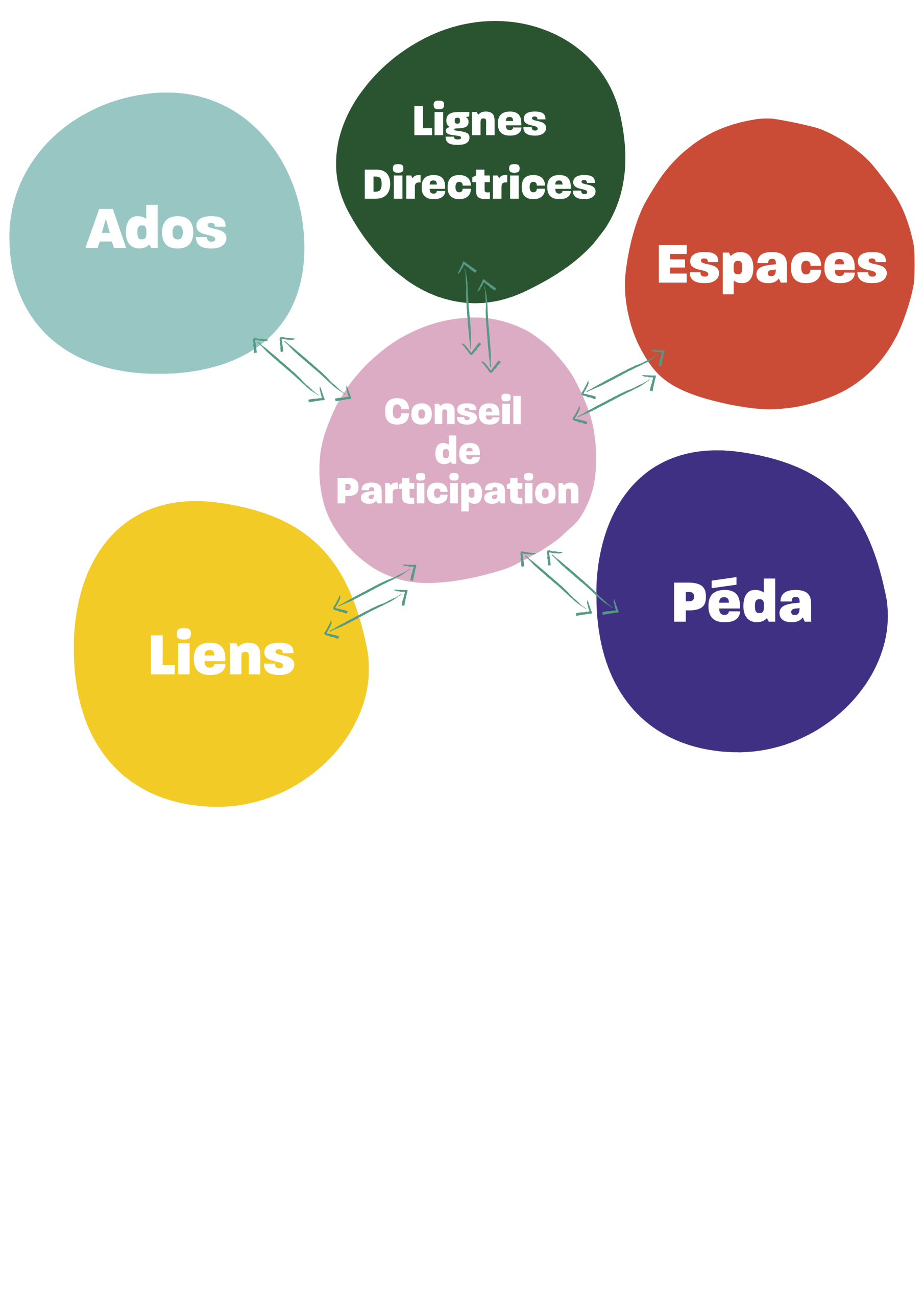 Pour réfléchir et élaborer les conditions d’accompagnement et d’enseignement à la cité école vivante, nous avons : le cercle Lignes Directrices, le cercle Pédagogique, le cercle Liens, le cercle Espaces et le cercle Ados.