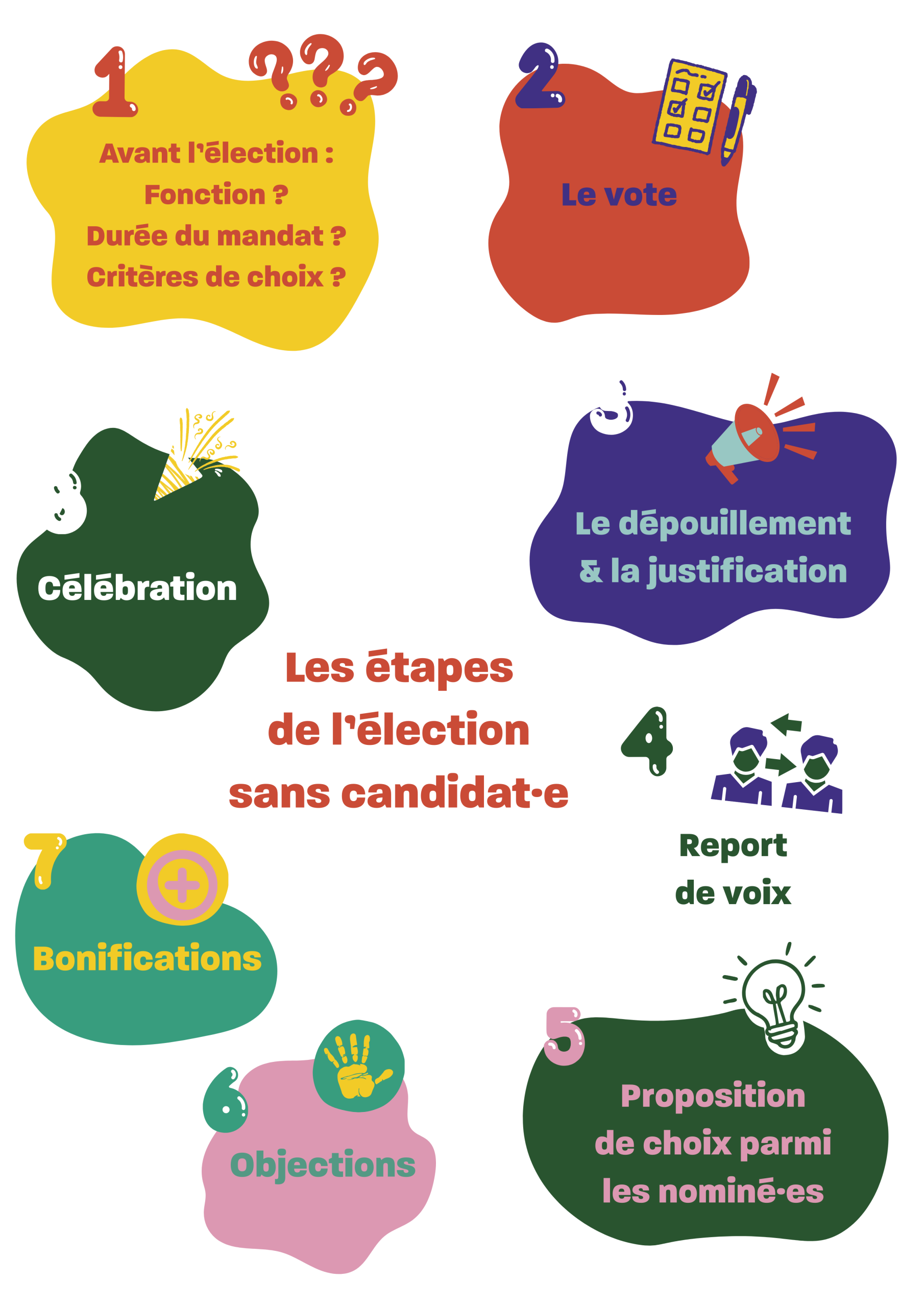 La répartition des responsabilités permet de prendre des décisions en plus petits groupes et d’identifier plus facilement à qui s’adresser en fonction des projets ou des problématiques. Toutes les décisions sont prises par consentement mutuel.